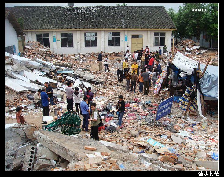 Only building collapsed is a school building in Fuxinzhen, 137 school children killed in the quake, but reported only 27. Parents angered.