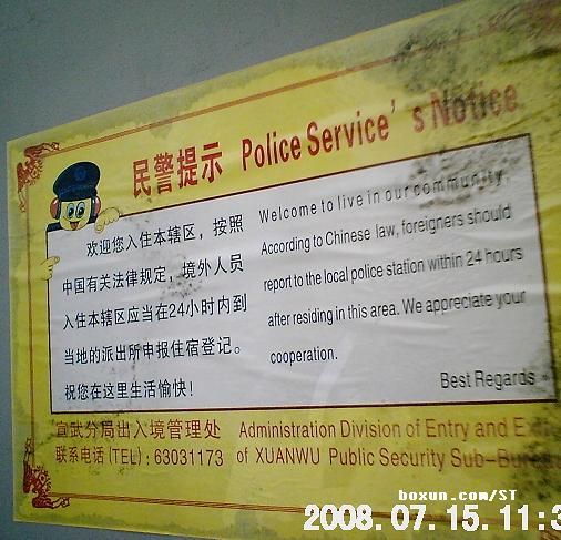 China started to enforce a law that requires foreigners to report to police station within 24 hours after residing.