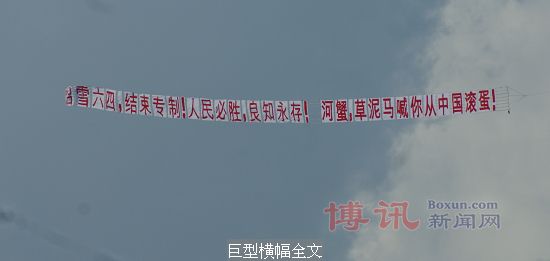 A group of overseas Chinese students flew two planes on June 4th 2010 tolling a huge banner on the Hudson River to commemorate the democratic movement in 1989. The banner was on the stage for three hours moving back and forth between the Statue of Liberty and China��s Consulate-General in New York. With special permission from Air Control Center, the minimum height of the banner was just 500 feet, allowing long range of visibility by pedestrians on the ground.